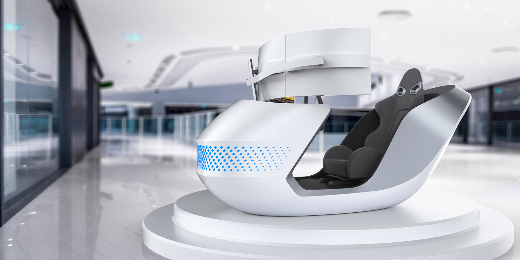 這款模擬駕駛艙造型靈感來自于天鵝,流線型設(shè)計賦予其優(yōu)雅的外觀,同時也象征著駕駛的速度感與未來感,富有生命力。采用藍(lán)色點狀燈作為艙頭的裝飾燈,提升了設(shè)備整體的氛圍感。三屏液晶顯示器高度模擬賽車的真實環(huán)境,座椅能夠自動調(diào)整角度和支撐力度,給駕駛員帶來更逼真的駕駛體驗。